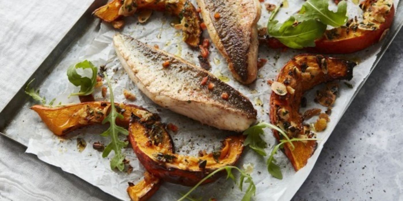 4. Spoel de rucola. Leg de vis en de plakjes pompoen op de borden en werk af met de